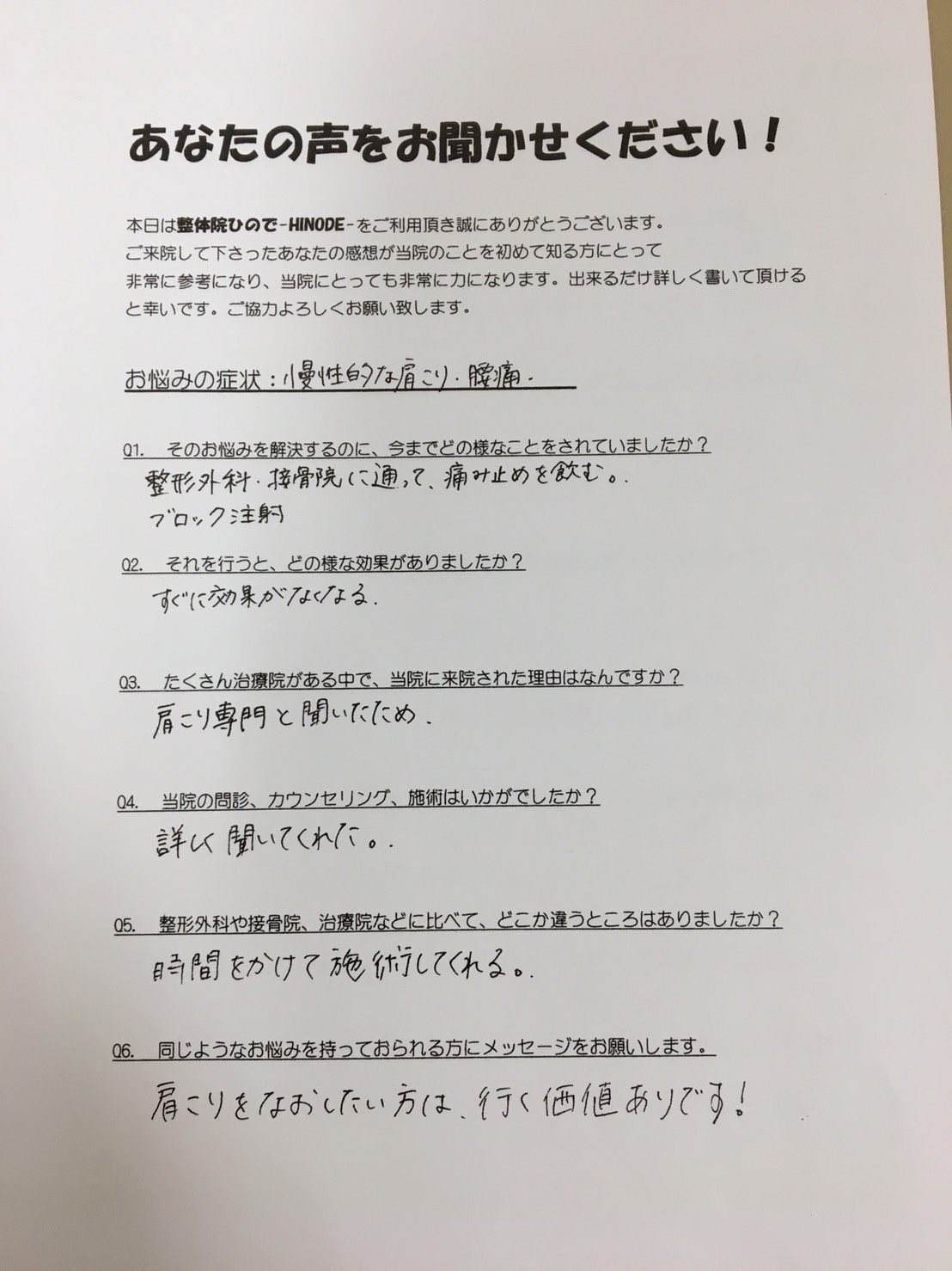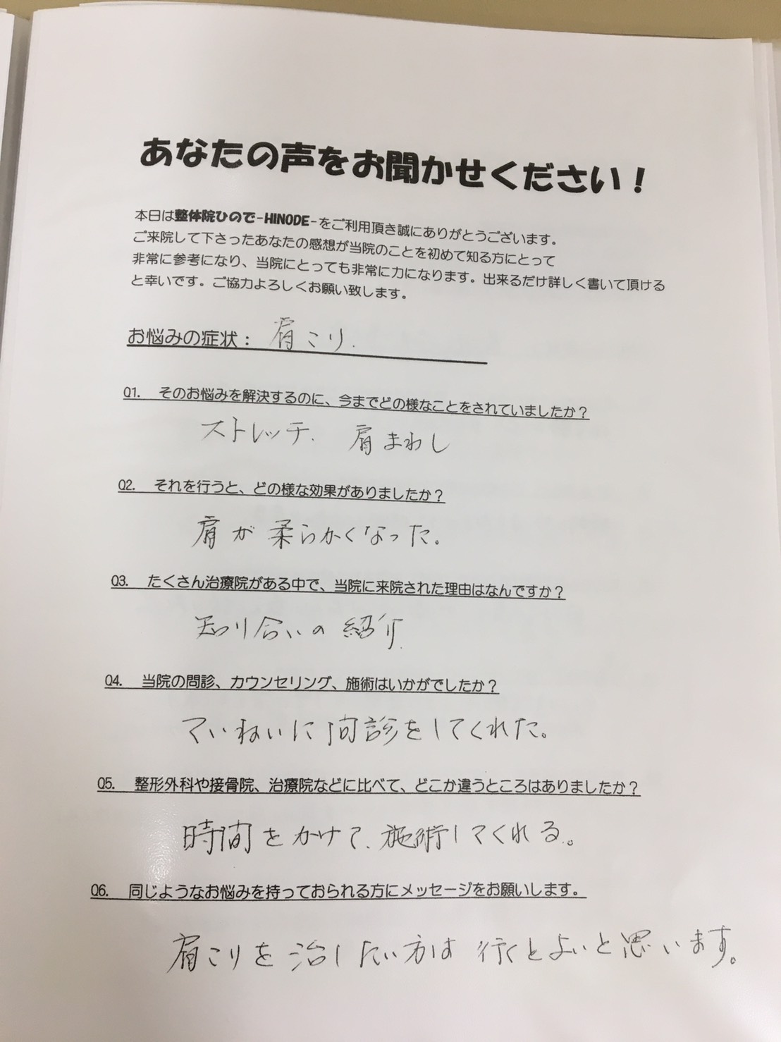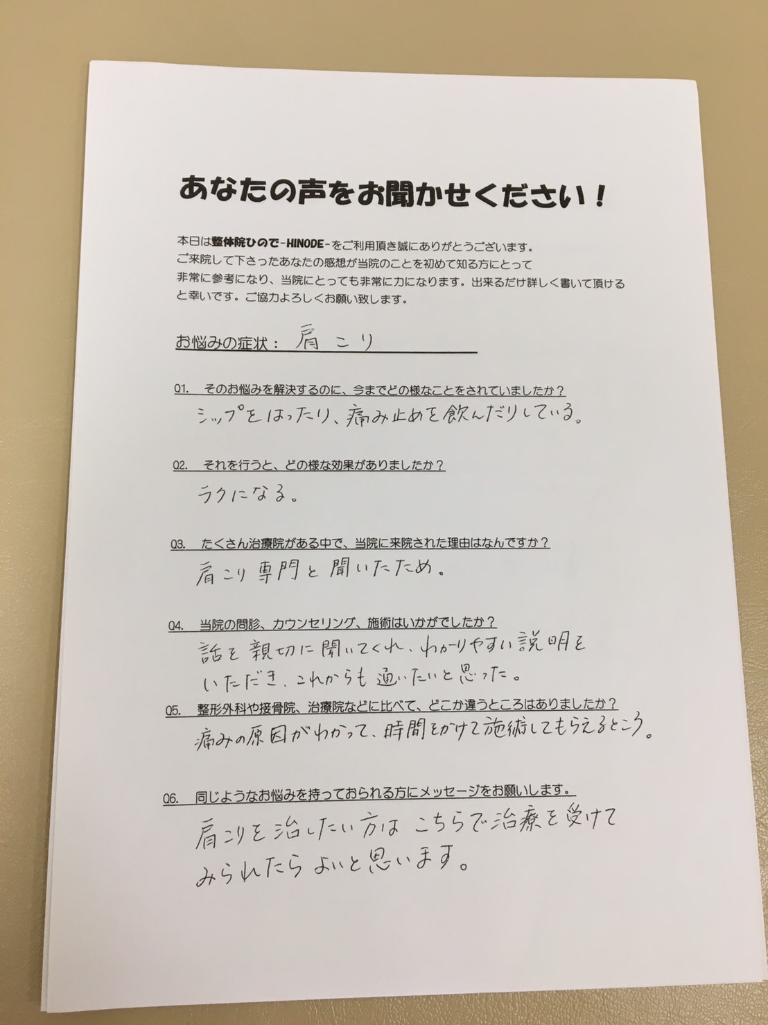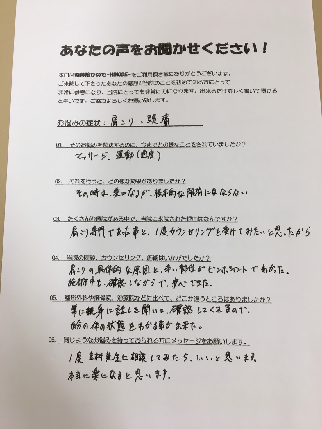 その方法で改善された方、もう肩こりは治らないと諦めている方は